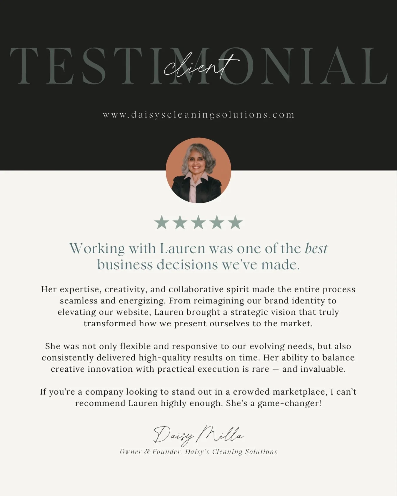 Working with Lauren was one of the best business decisions we’ve made. Her expertise, creativity, and collaborative spirit made the entire process seamless and energizing. From reimagining our brand identity to elevating our website, Lauren brought a strategic vision that truly transformed how we present ourselves to the market.