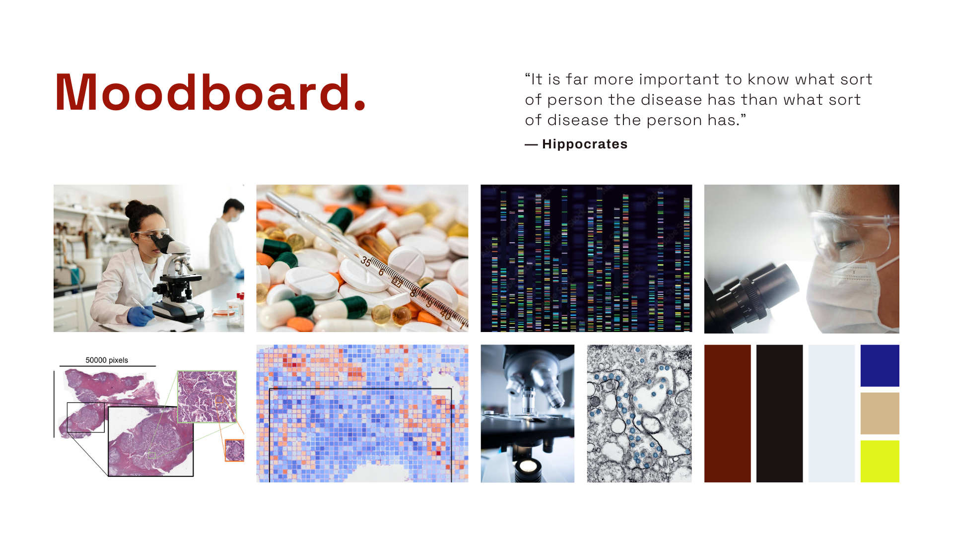 Building the BrandWe led a comprehensive rebrand from the ground up, beginning with a detailed mood board to define the visual and emotional direction of the brand. The resulting identity balances confidence and clarity through a bold yet restrained palette of red, black, and cream—paired with genomic grid-inspired imagery that introduces structured square elements throughout the system.